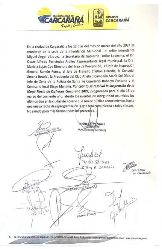 «Debido a los hechos de inseguridad de público conocimiento ocurridos en los últimos días en Rosario, y luego de reunirnos con autoridades del Club Atlético y Biblioteca Campaña y Policiales, se ha decidido en forma conjunta reprogramar la Mega Fiesta de Disfraces Carcarañá 2024 hasta nuevo aviso.
