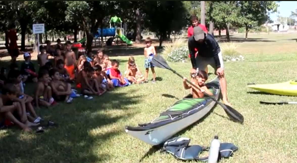 Una mañana de sol, ideal para las actividades acuáticas. Los chicos de la colonia de verano del Club Campaña escuchan atentamente a Diego Pazzelli dando instrucciones sobre cómo subirse, y maniobrar un kayak; las medidas de seguridad y conocimientos básicos para el uso de esta embarcación. Luego: cada uno pudo probar sus conocimientos dando una vuelta en la pileta.